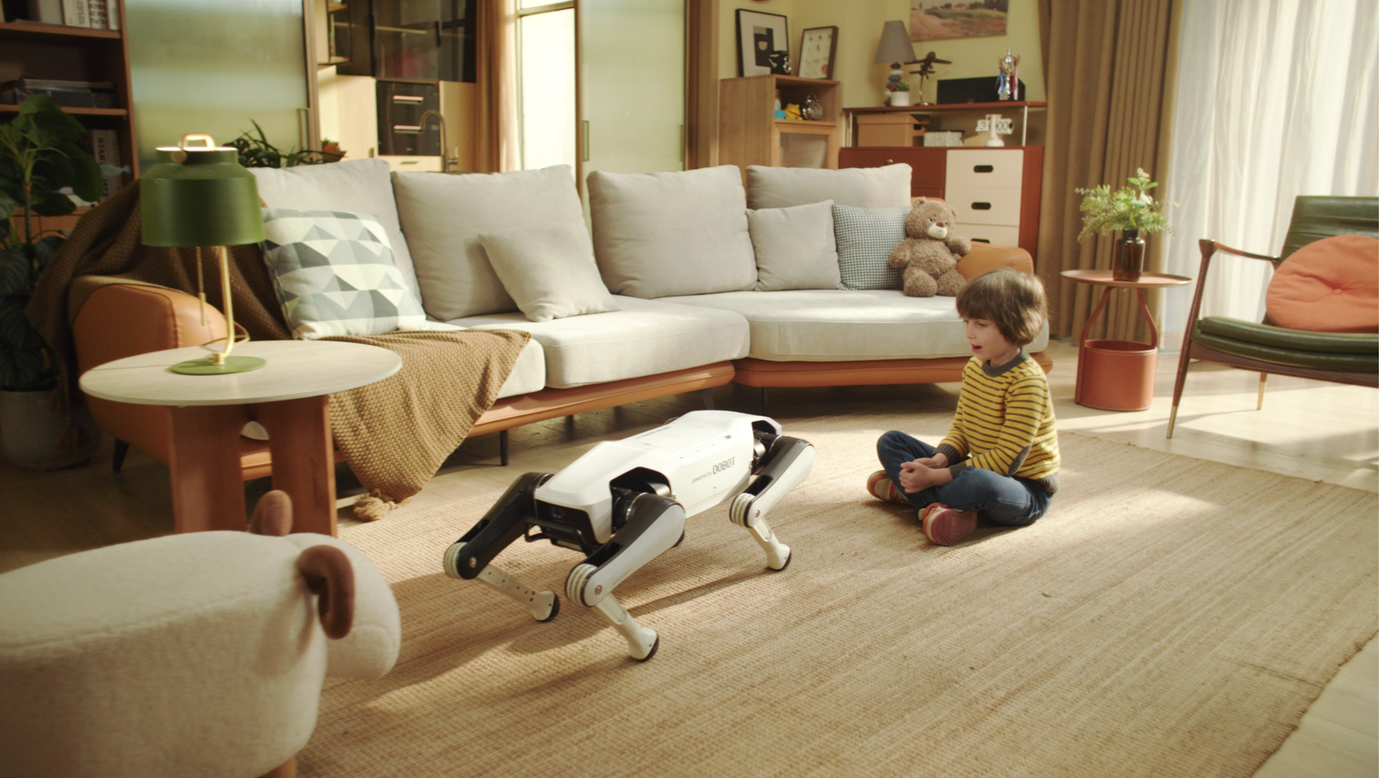 Dobot’s newly-launched Rover X1 robot dog interacts with a kid in home environment.